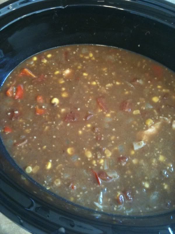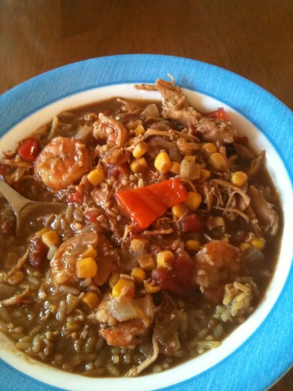 This week, I'm going to try my hand at meal planning. I have a chicken and shrimp gumbo going in the crock pot for today. I've never made a gumbo before, so I cheated and bought dry roux at the store rather than attempt to make it myself. I'll save that for another day. To make the gumbo, I sauteed a chopped onion, bell pepper, and minced garlic in a skillet with 1/4 cup water and 1/4 vegetable oil. Most recipes call for celery and okra, but I don't have celery in the house and I can't stand okra, so I left them out. While the veggies were cooking, I turned the crock pot on high and threw in 36 oz of chicken stock, a can of diced tomatoes, a can of corn (drained), a dash of salt, black pepper, cayenne pepper, paprika, chili powder, and about 1 tbs of sugar. After the onions were translucent, I removed the veggies from the heat and added 1 cup of the dry roux and stirred it up, then threw that in with the broth. I have two boneless skinless chicken breasts in there cooking, and once they're cooked through I'll shred them by hand, throw them back in, and turn the heat on the crock pot down to low. About an hour or so before I plan to serve it, I'll add some frozen raw shrimp that is already peeled and deveined. I'll serve it over rice that I plan to make in my brand spankin' new rice cooker.