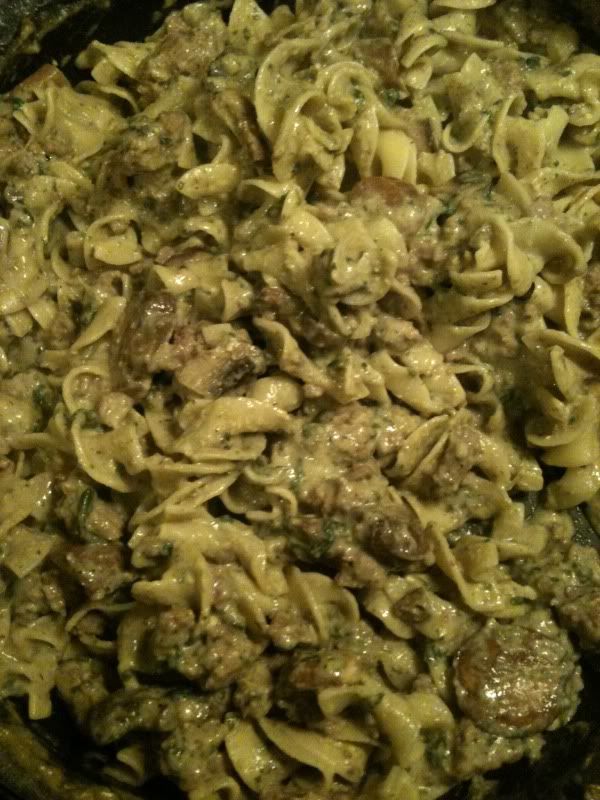 Brown your meat and drain it, then put it back in your skillet. Add your cream of mushroom soup plus one can full of water, your mushrooms, spinach, cheese, and seasonings. Stir it all up and turn the heat on medium, stirring frequently. While that's simmering, boil your noodles and drain them. When your sauce is no longer runny, stir in your noodles and serve it.
