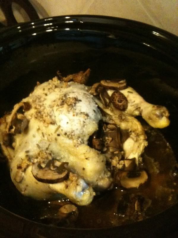 I have a whole chicken cooking in the crock pot as I type. I combined some minced garlic, salt, pepper, rosemary, sage, and thyme in a bowl and mix it up. I then took the garlic mixture and shoved generous amounts of it under the skin of the entire chicken. I stuffed the body cavity with sliced baby portabella mushrooms and the leftover garlic, and then let it cook in the crock pot on high for the afternoon.